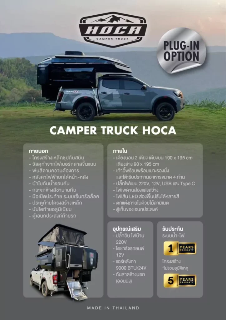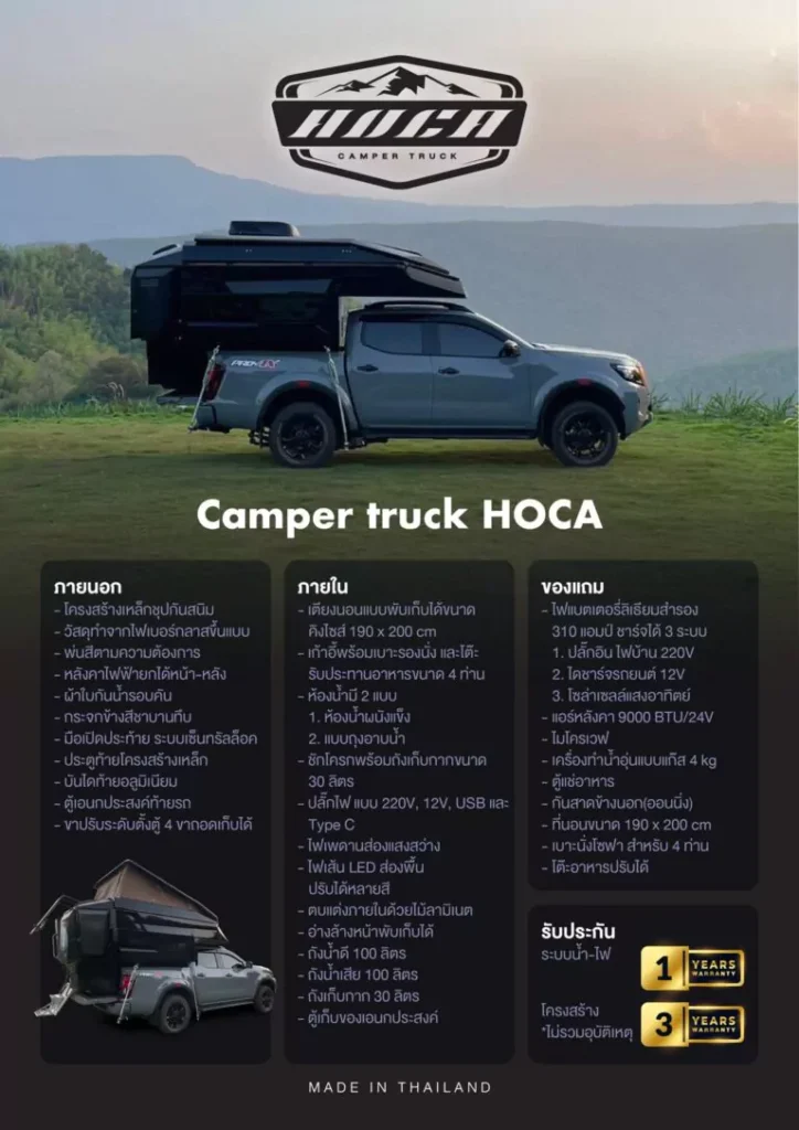 Hoca Campertruck นำเสนอรถบ้าน Motorhome รุ่นใหม่ล่าสุด ที่ออกแบบมาเพื่อรองรับไลฟ์สไตล์ของนักเดินทางยุคใหม่ โดยต่อเติมจากรถกระบะแคปในรูปแบบ Camper Truck หรือ รถบ้านเคลื่อนที่ ที่ผสานความสะดวกสบาย ความล้ำสมัย และความประหยัดไว้ในคันเดียว